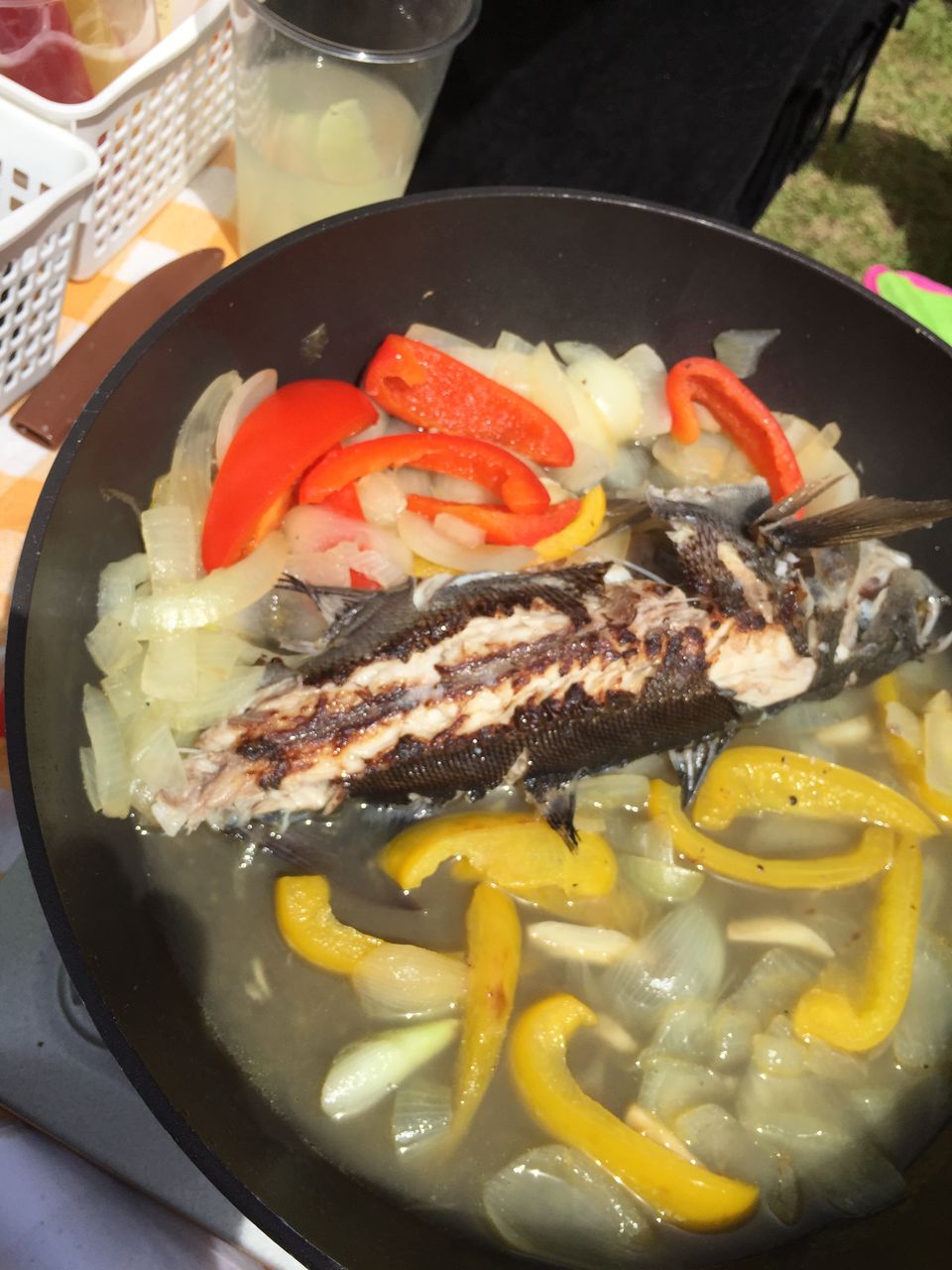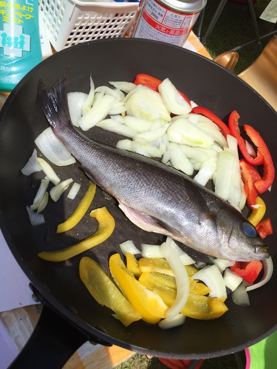 沼津港でかったイサキと玉ねぎとパプリカ、ニンニクを焼いて。