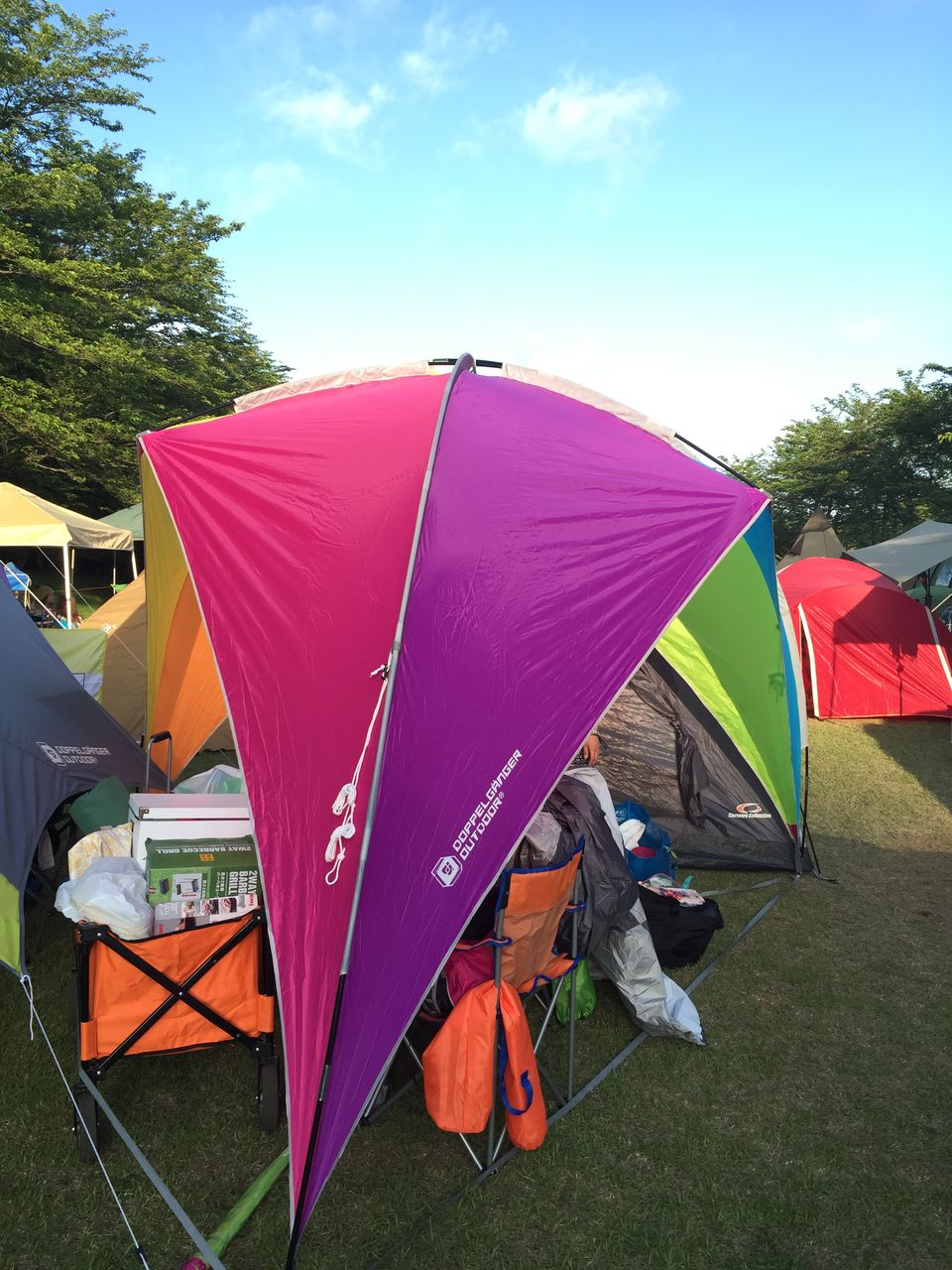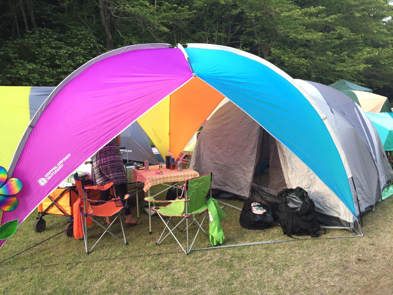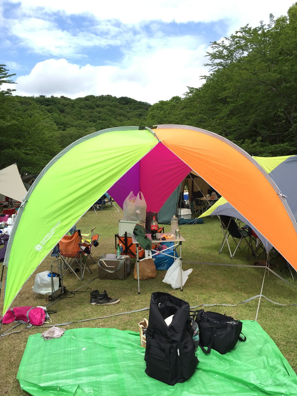 三点で広げるタープで、カラフルでいいでしょ?