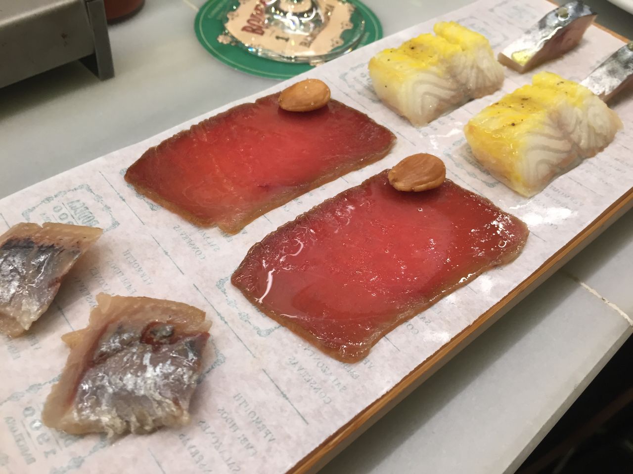 多分、左からアジの燻製、サーモンの燻製とナッツ。白身魚のなんか、サバ。