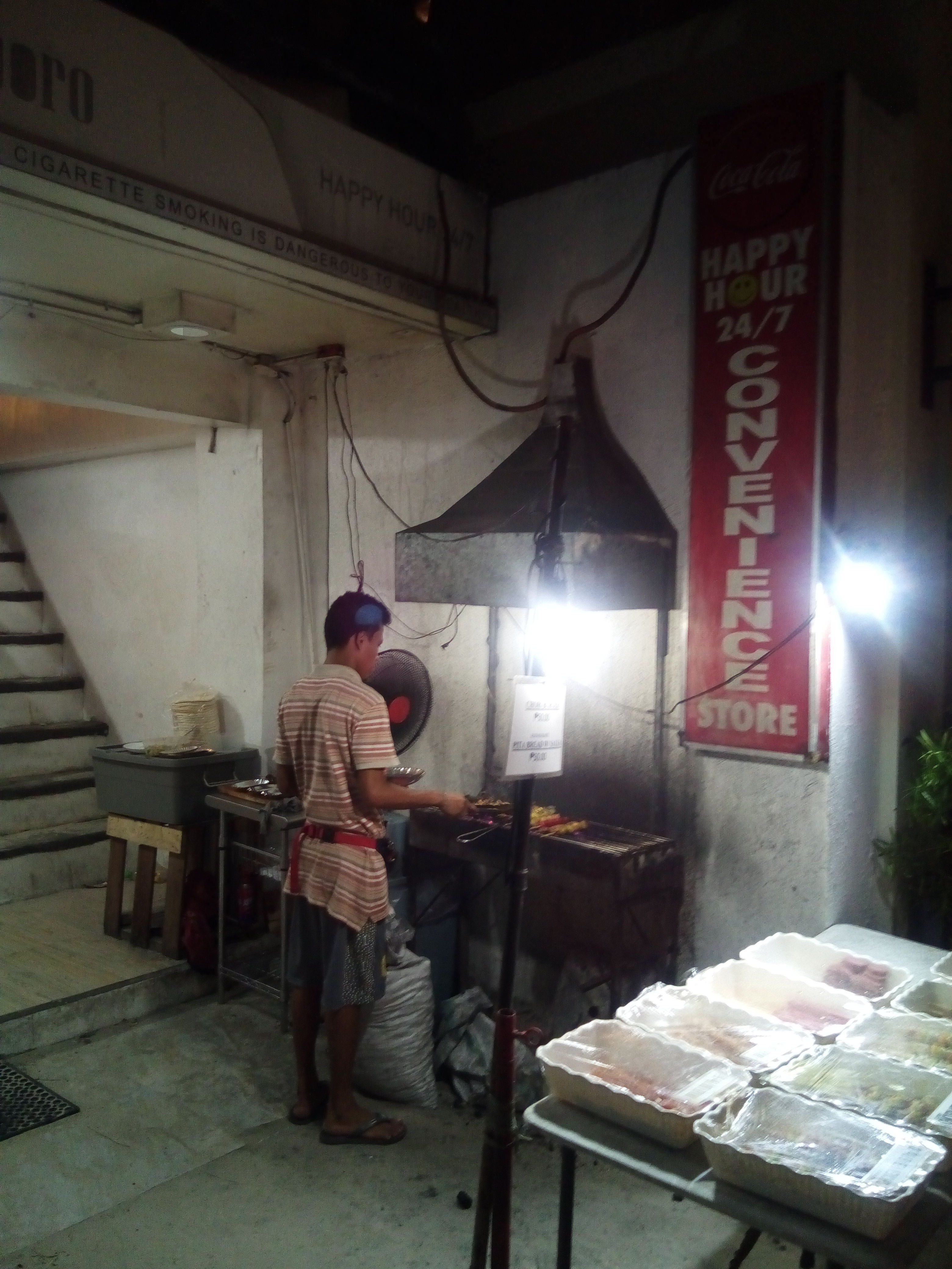 ホワイトビーチの中心にあるコンビニのお店の前で焼いているBBQ。