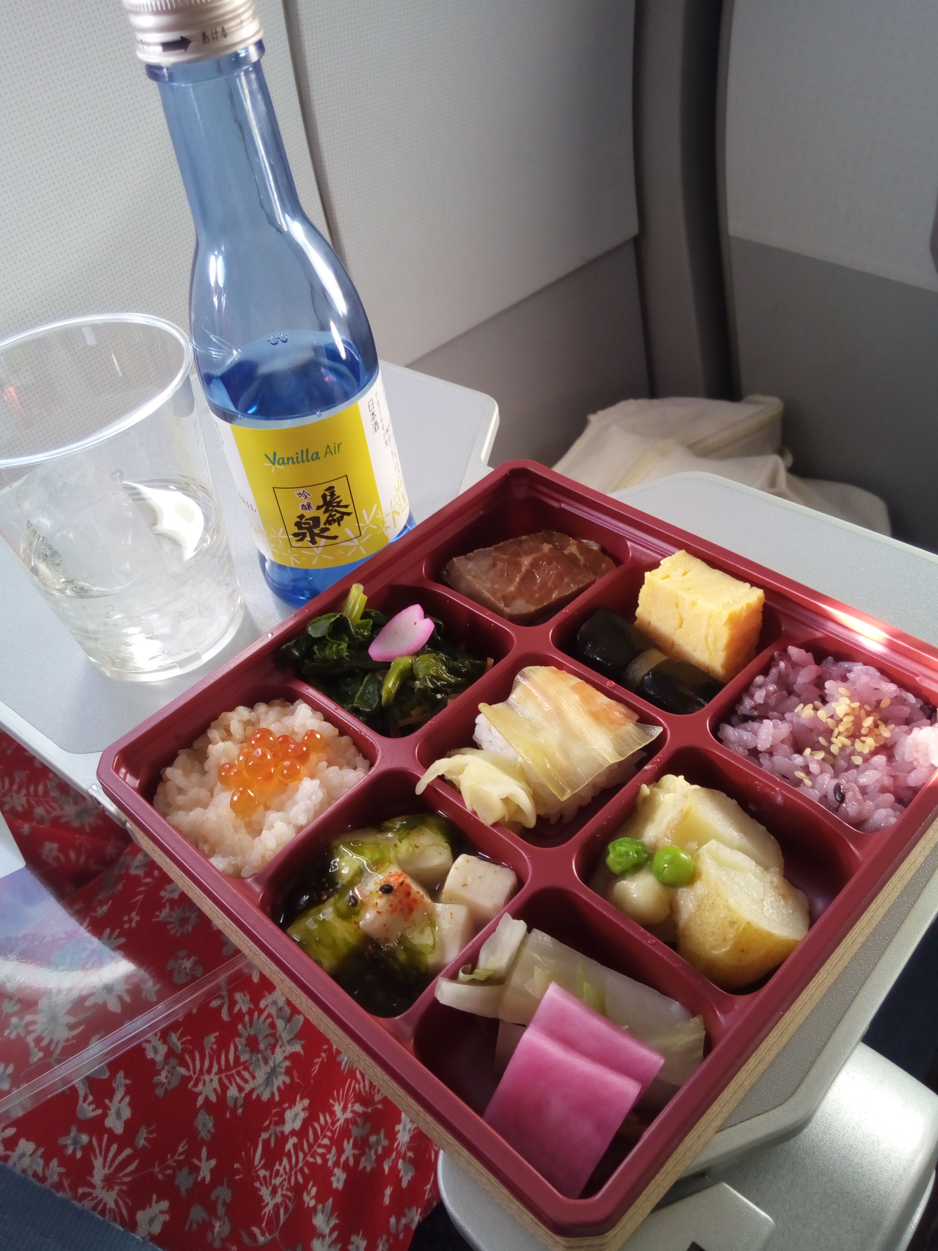 機上でお弁当と日本酒。