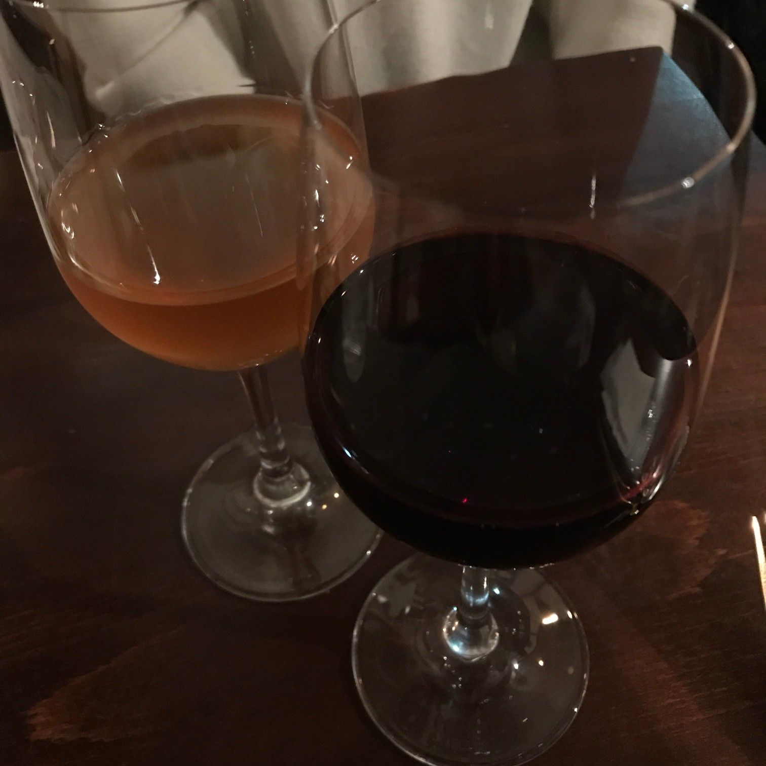 いかにもオーガニックという感じのオレンジワイン(お店では白ワイン)と赤。