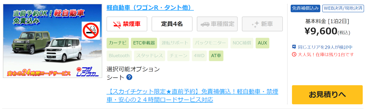 例えば、2022年8月31日から1泊のレンタカーで最安値で9,600円。。。