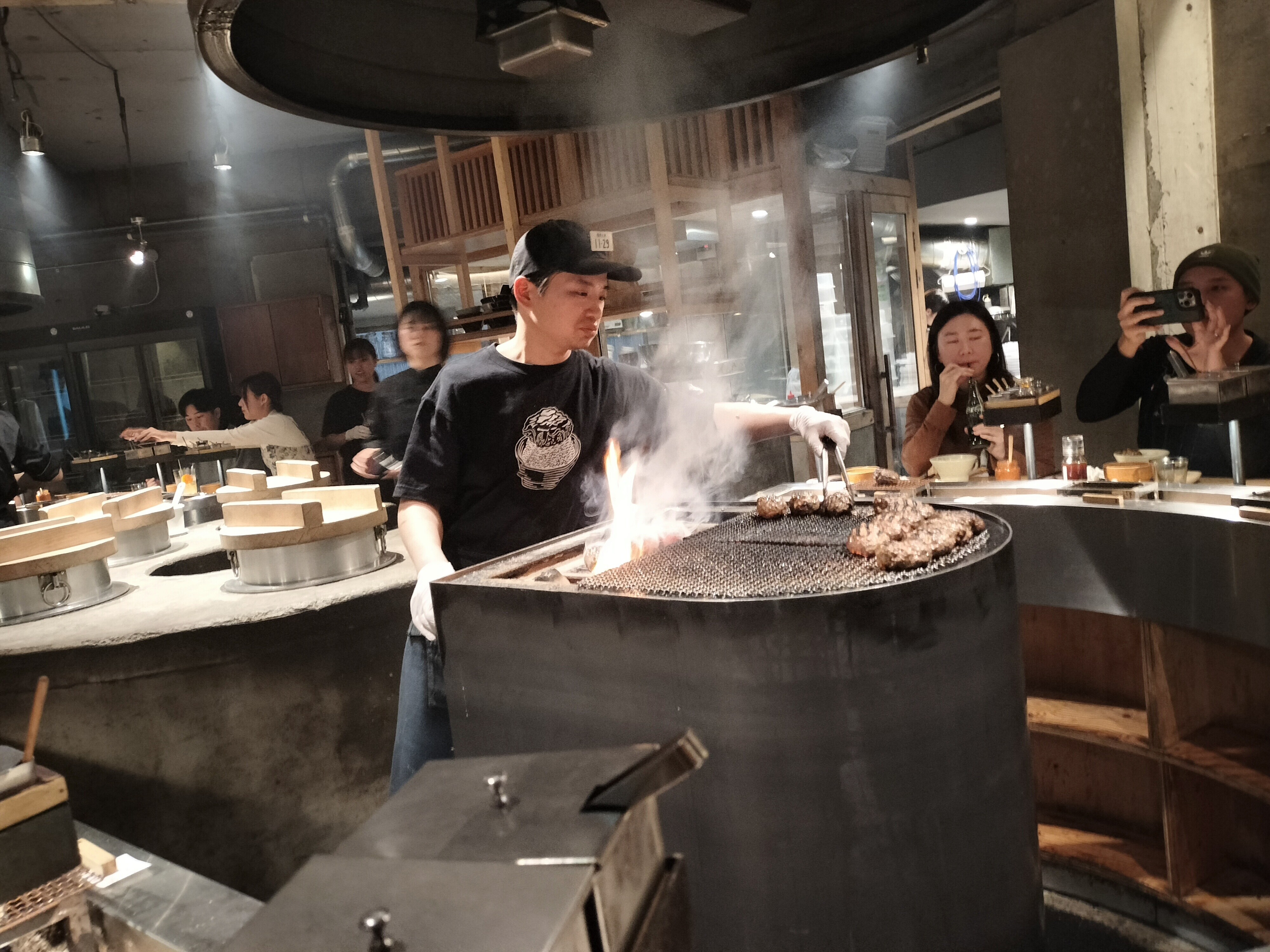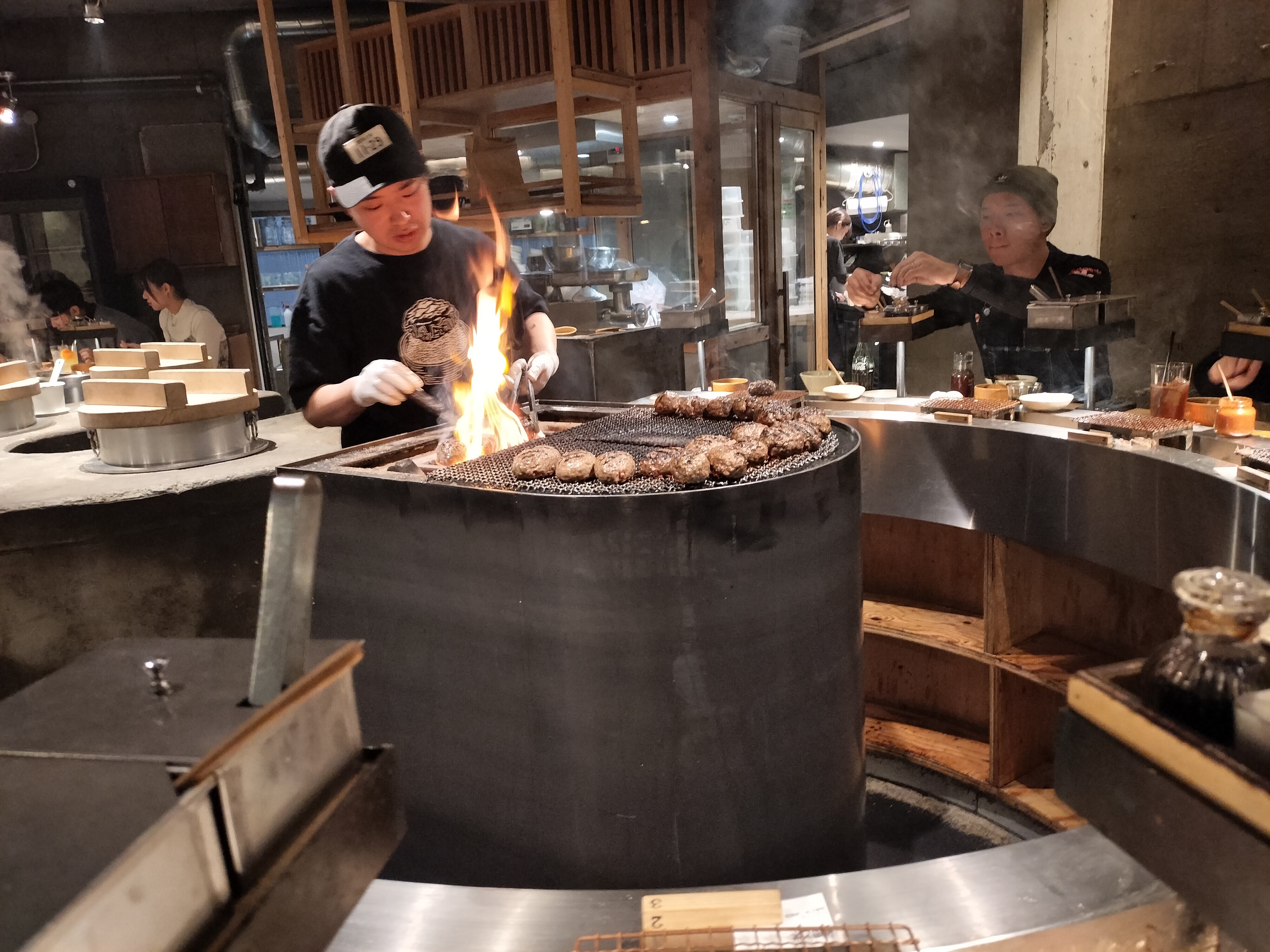 焼きながらフロアを見てオーディエンスに合わせてハンバーグを配っていく。