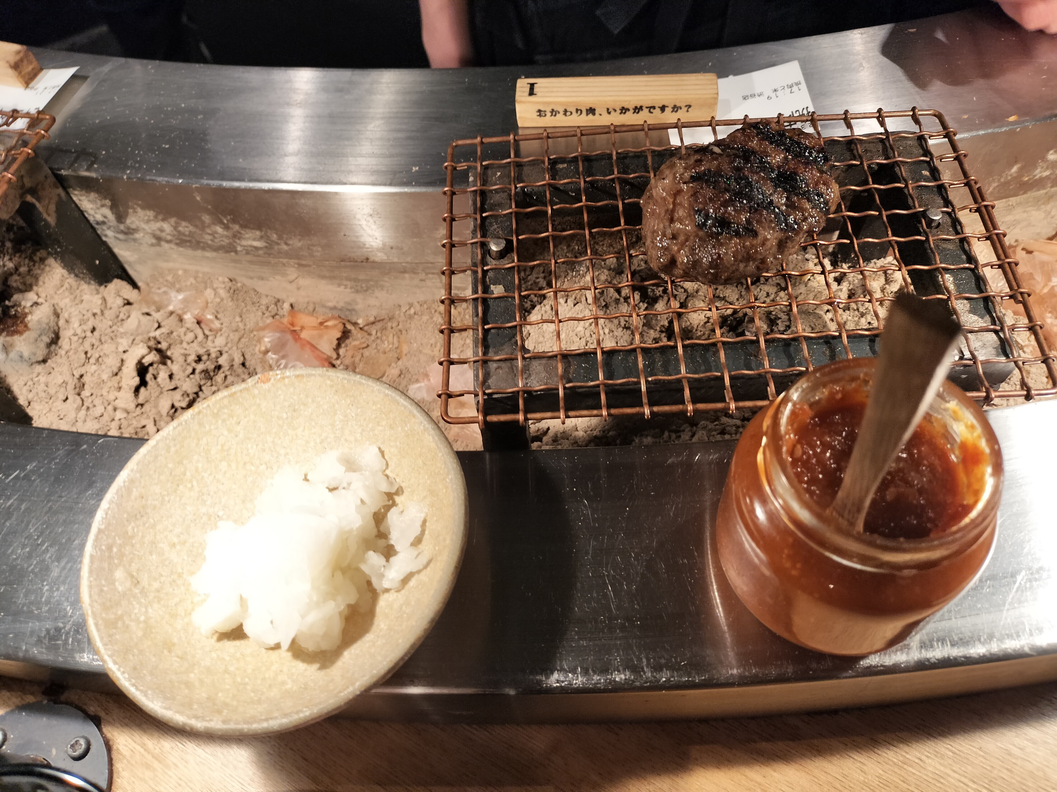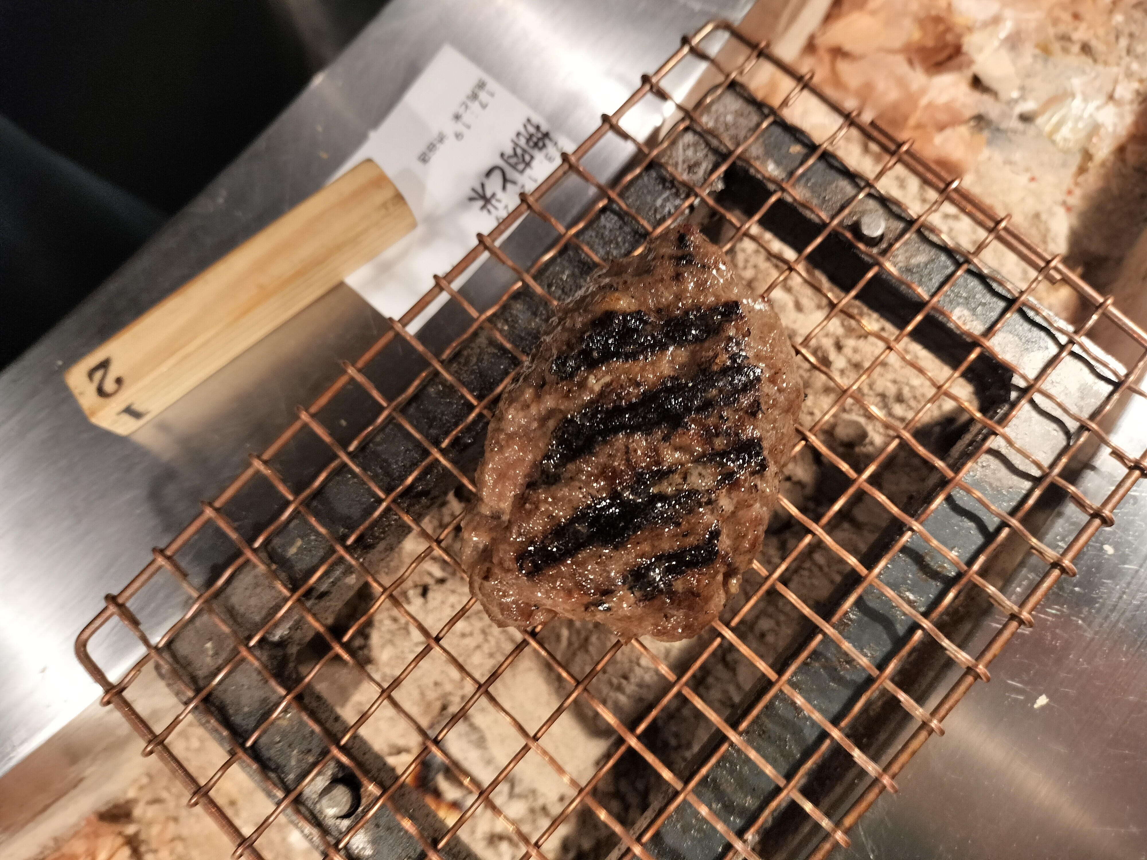 ハンバーグを炭火で焼いてもらっています。