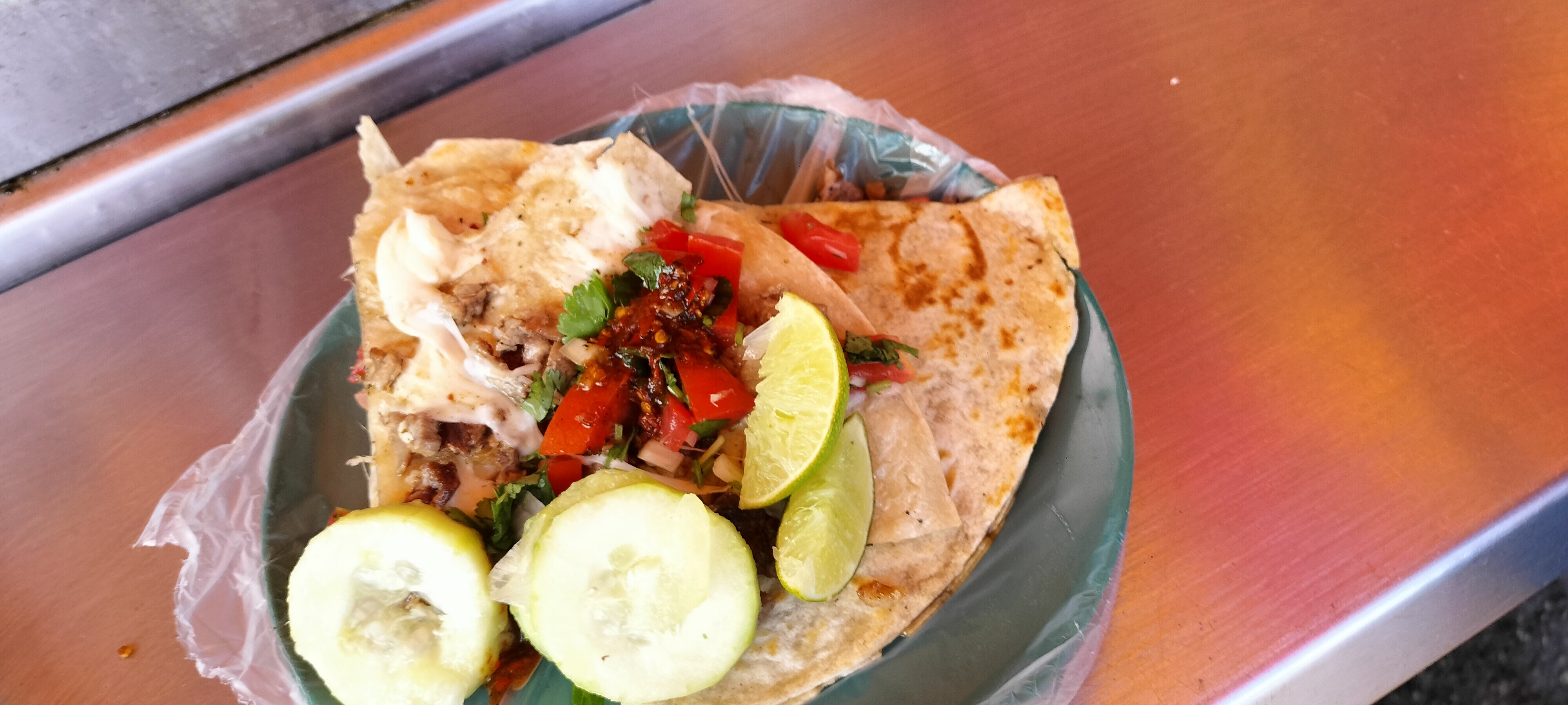 鶏と牛のタコスかな。