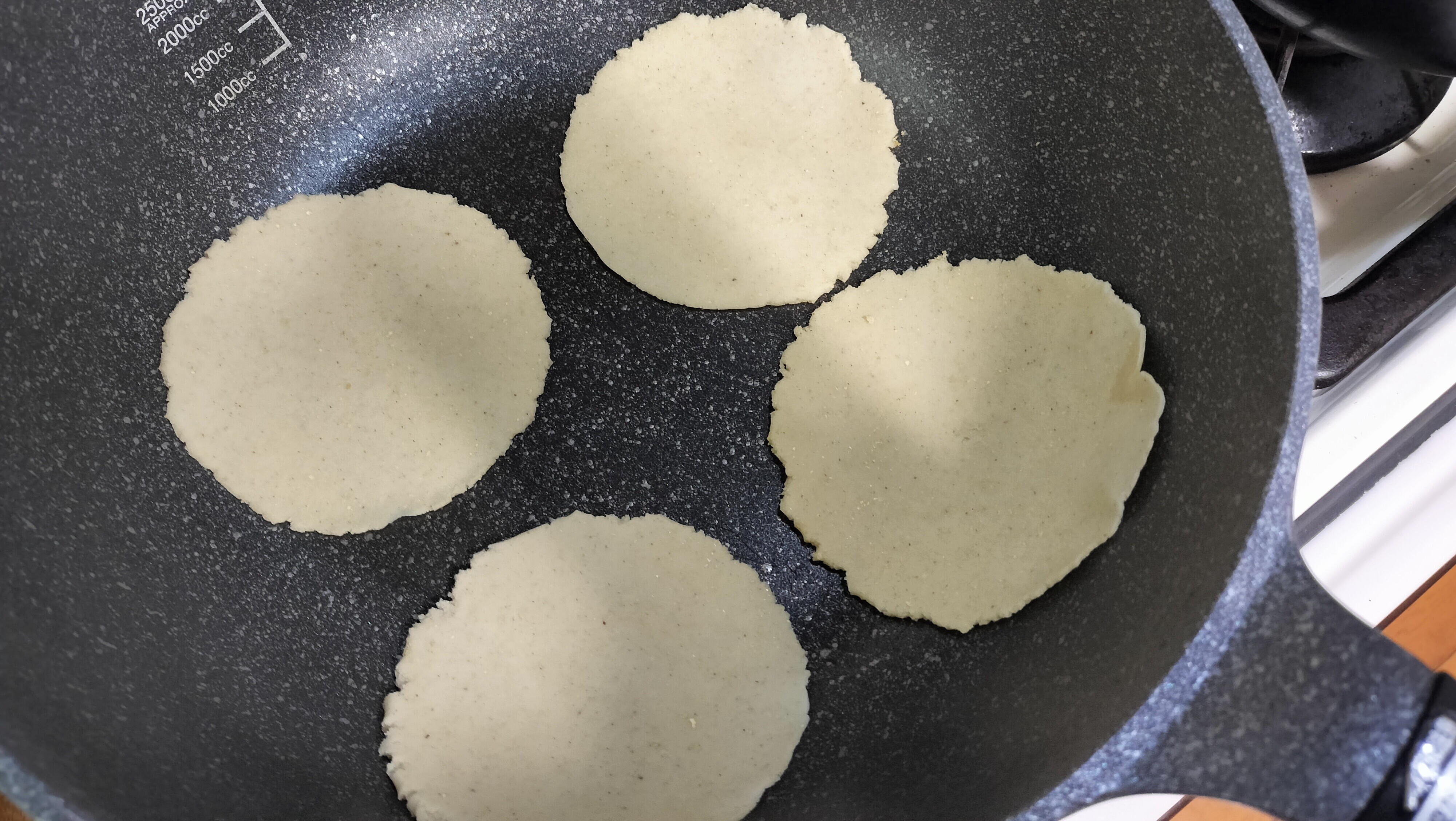 トルティーヤを伸ばす時は、丸めた生地をジップロックの袋にはさんで、フライパンの底で押し付けるとこんな感じで広がります。