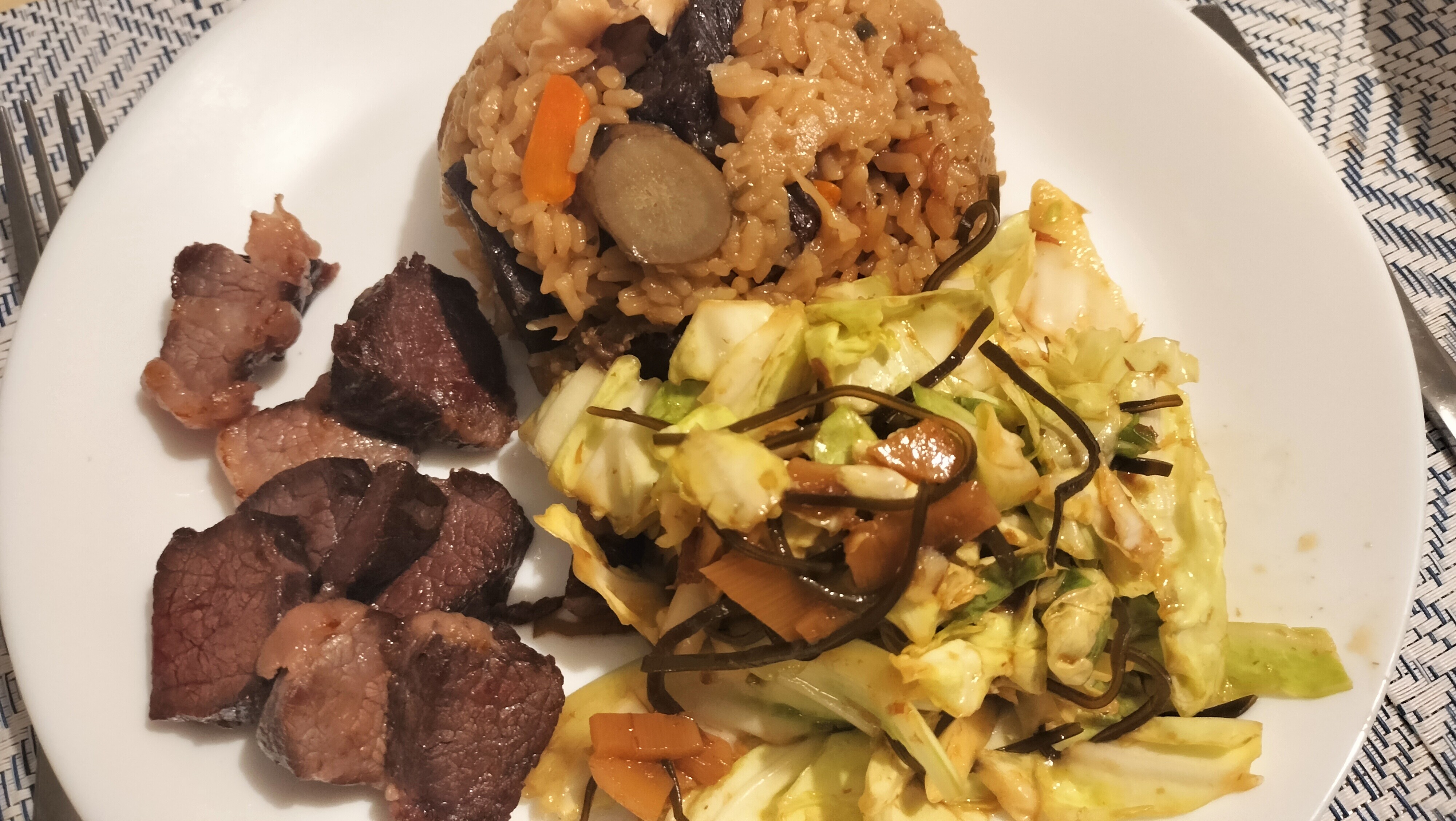 干し肉を焼いて、キャベツを軽くつけて、干し肉の炊き込みご飯。