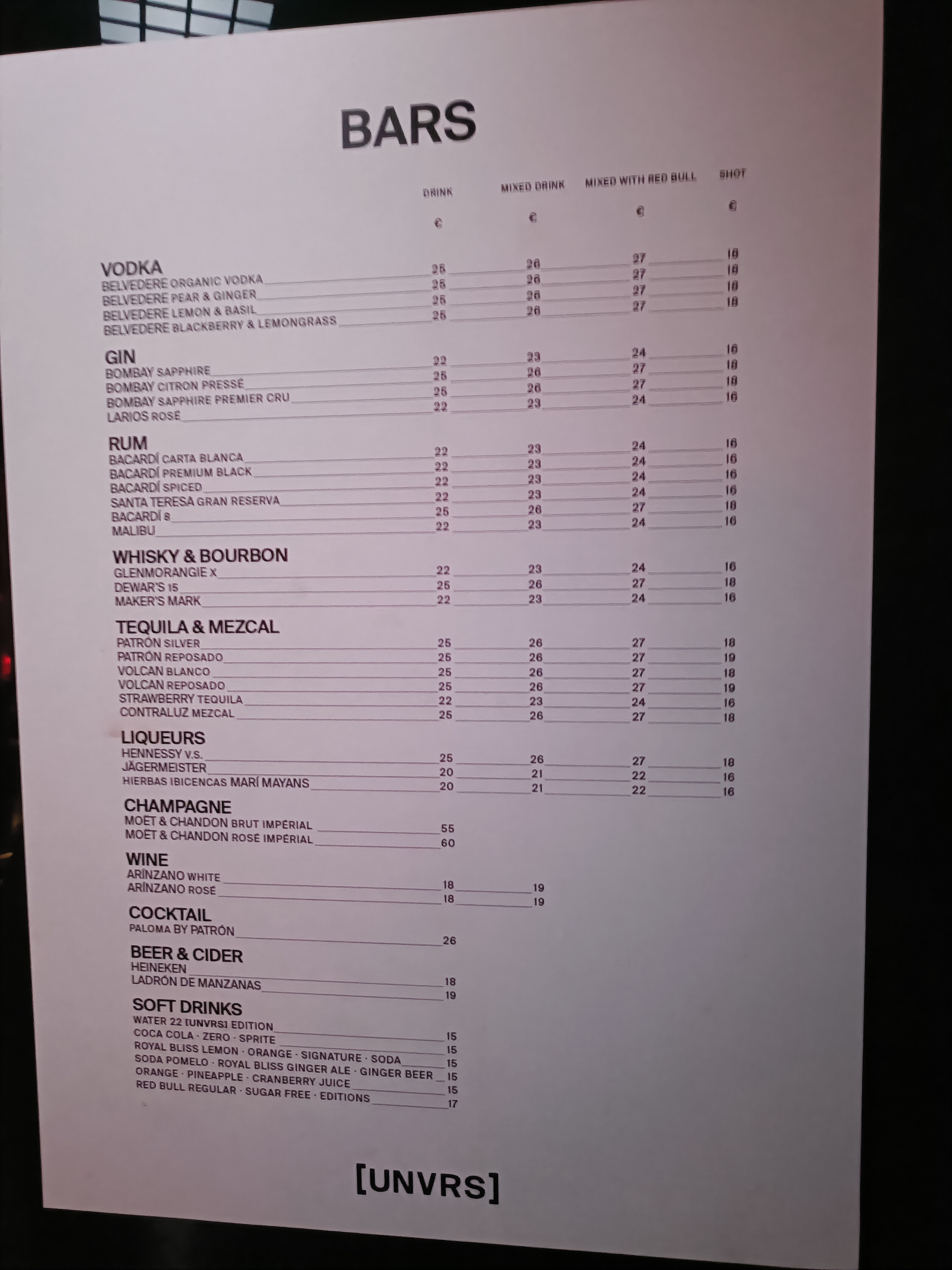 UNVRSのバーメニューです。