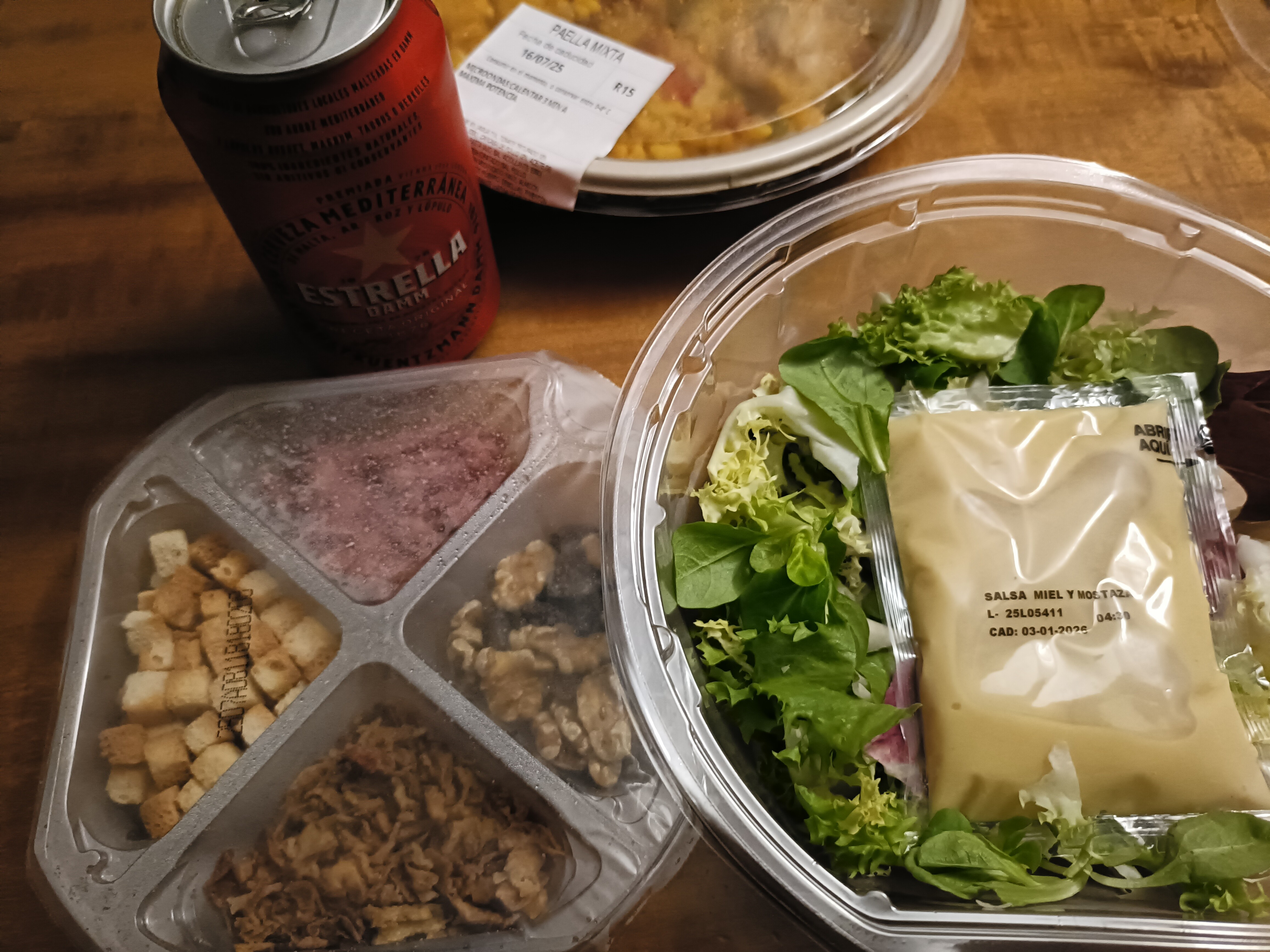 スーパーで買ってきたパエリアとサラダ、そしてビールで十分満足できました。