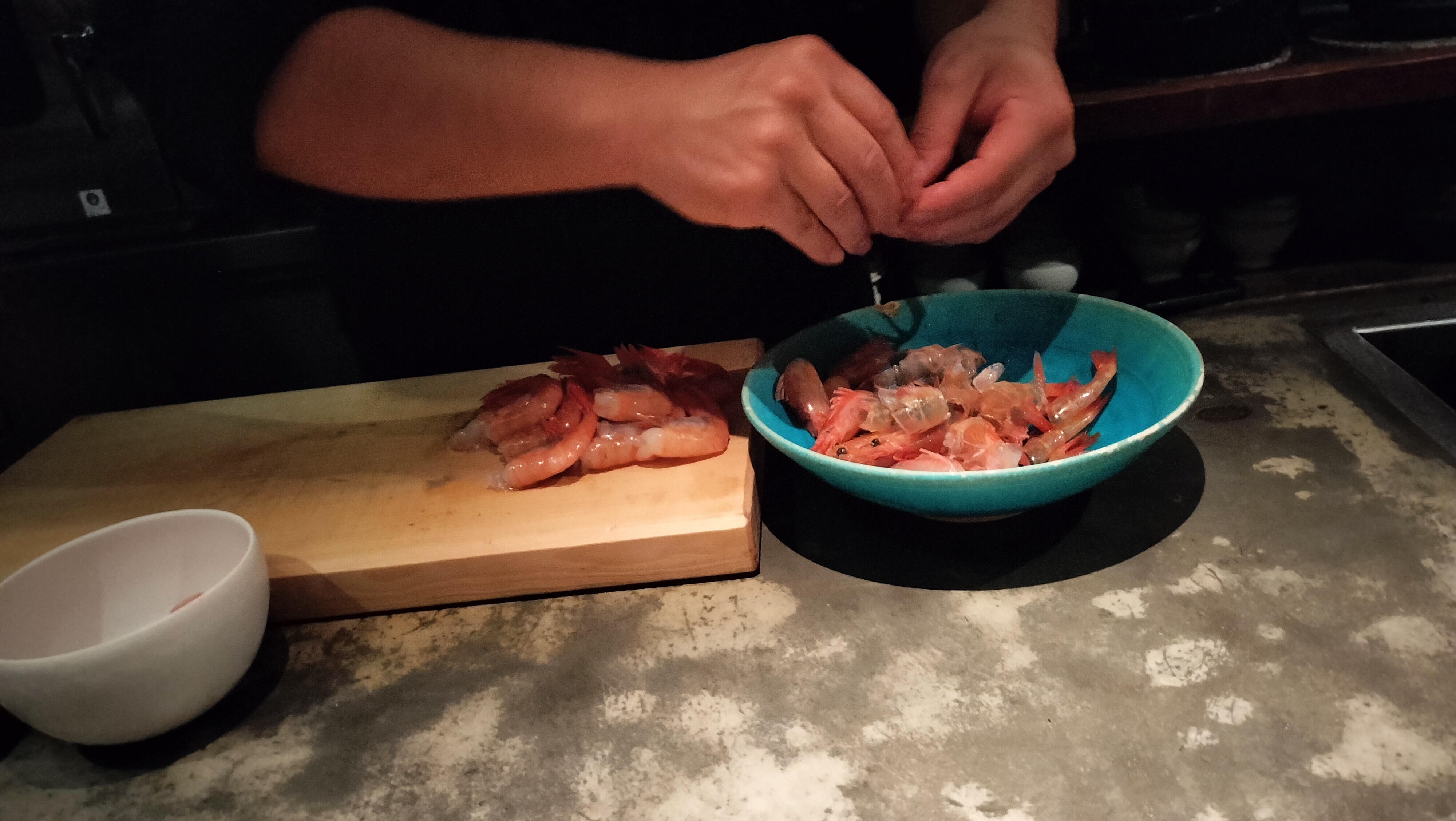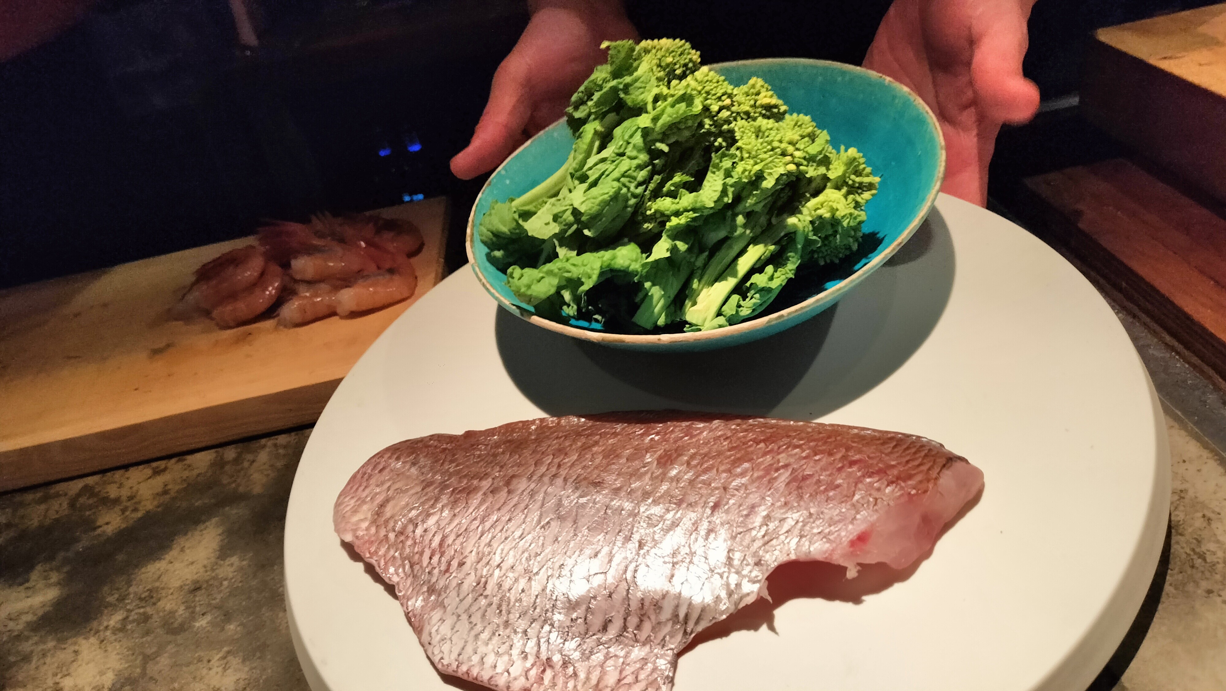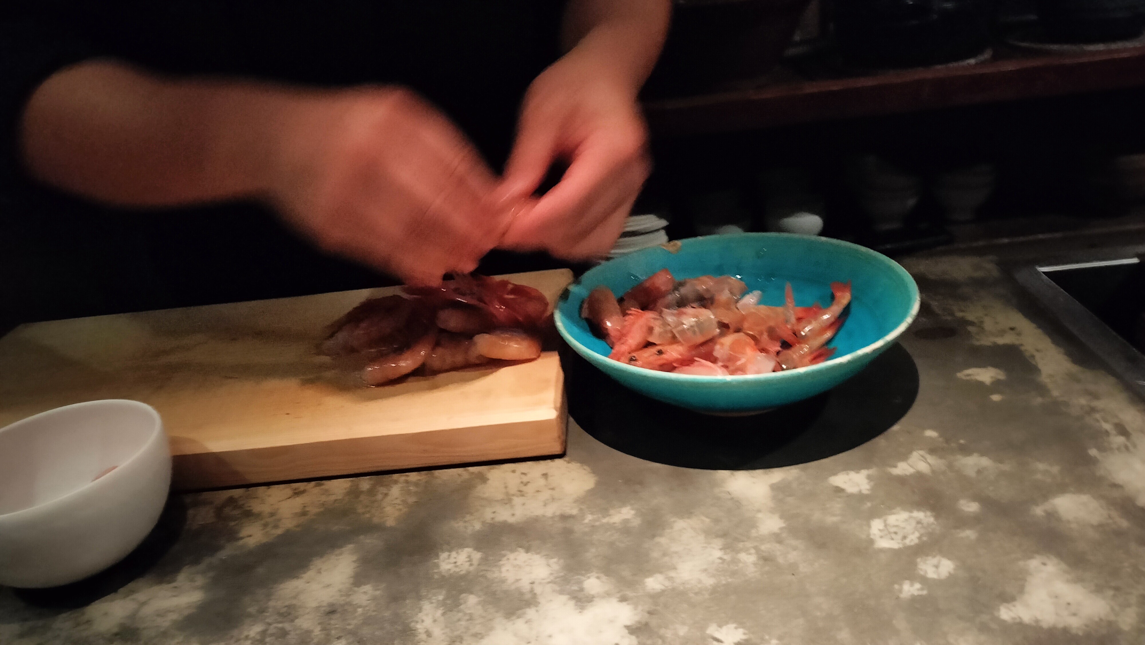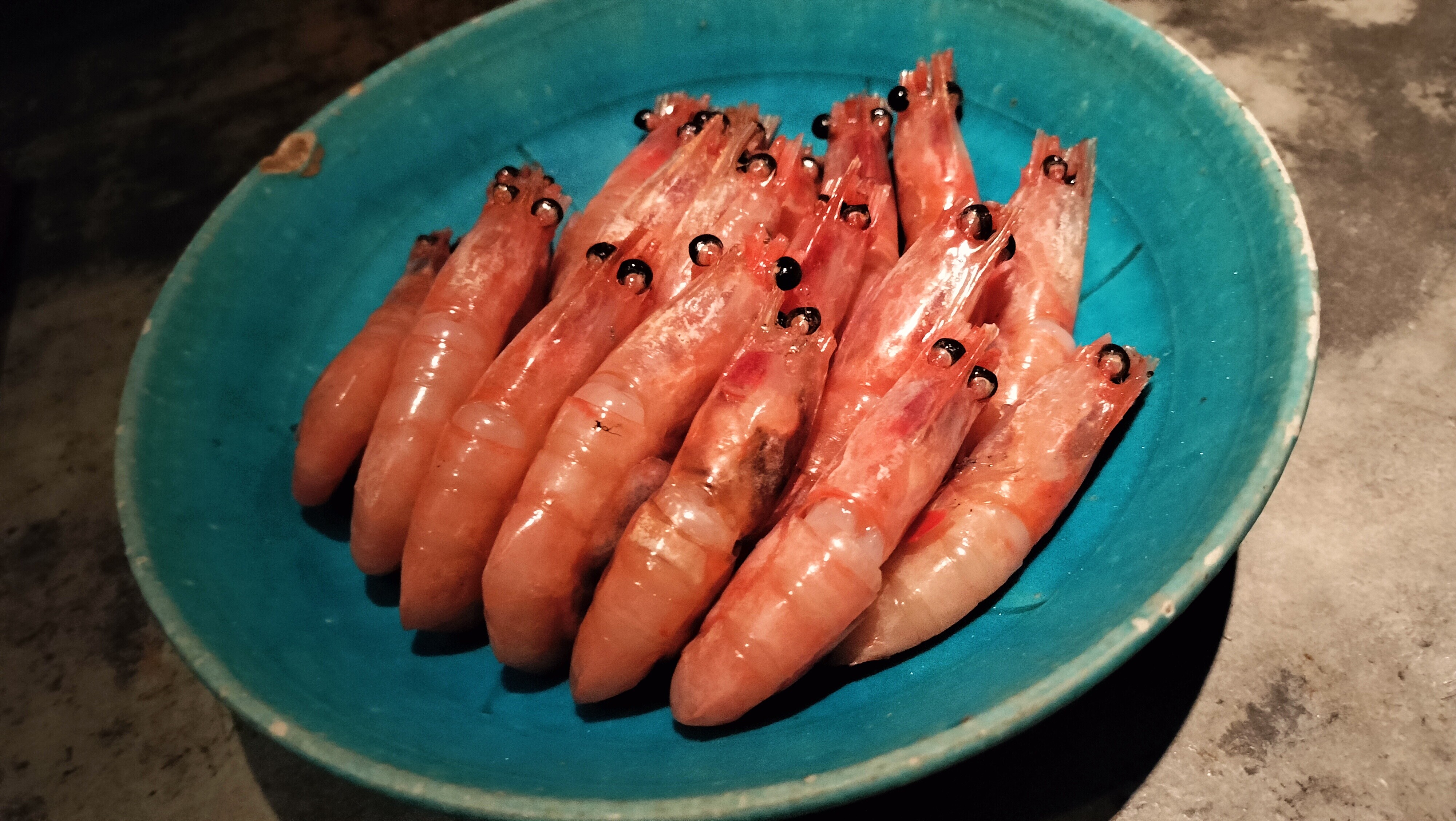 鮮やかなブルーの皿に乗った海老は、まるで心地よいハイハットの刻み。